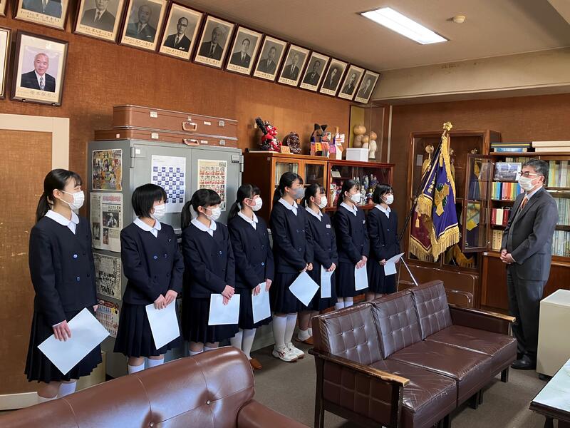 校長室に入り、合格の喜びと今後の抱負を述べ、先生方から祝福の言葉をもらい、元気に帰って行きました。