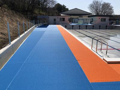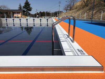 現在は、ステンレスのプール本体も取り付けられ、プールサイド、更衣室、トイレもほぼ仕上がってきました。今年の水泳の授業がとても楽しみです!