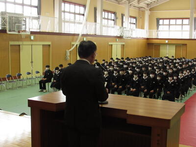 始業式 ●式辞では「大きな声で歌が歌える学校」「笑顔のある学校」にしようと話しました。