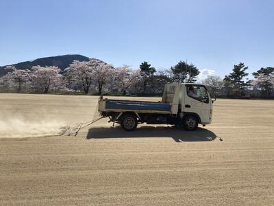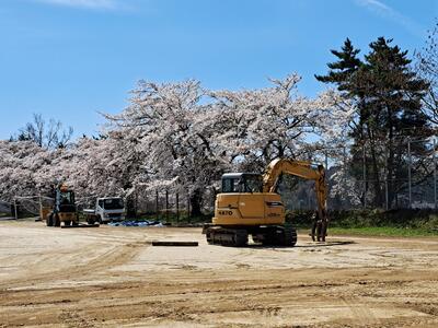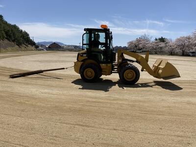本日(4月10日)、カトウノ興業様のご厚意で校庭の整備をしていただきました。また、重機の燃料については丸六スタンド様にご提供いただきました。