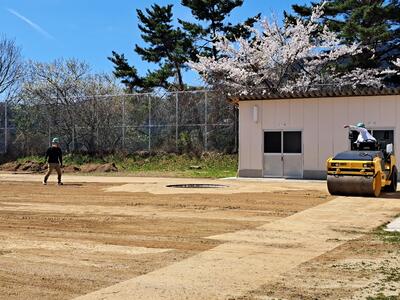トラックやホイルローダーで金属のグランドレーキを引いて整地し、仕上げにロードローラーで校庭を押し固めていただきました。車の乗り入れがあったためにガタガタしていた校庭がすっかりきれいになりました。