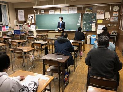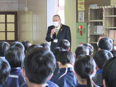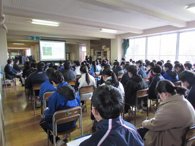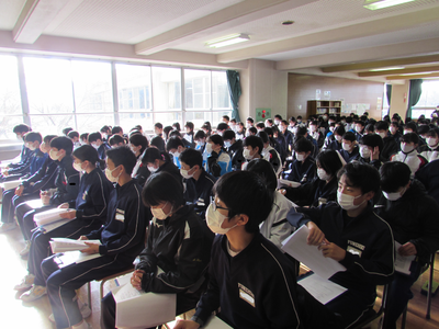 2月21日(火)、2年生を対象に2学年ホールにて「保護司講話」を開催しました。「保護司」という仕事の内容や活動の状況について、田村地区保護司会会長の時田敏孝様を講師としてお招きし、ご講話いただきました。