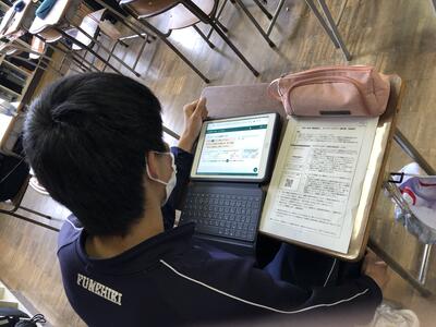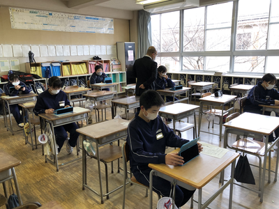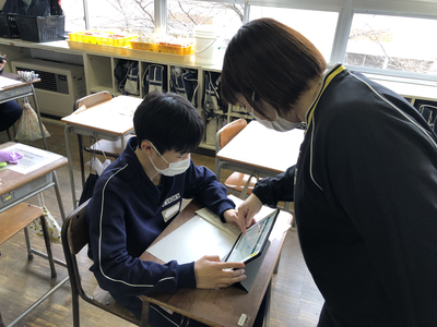 毎年4月、全国の中学3年生を対象に行われる全国学力・学習状況調査ですが、令和5年度は4月18日(火)に国語・数学・英語の3教科が実施されます。また、英語の「話す力」をみるため、タブレット端末を利用した試験が行われます(この試験のみ5月9日(火)実施予定)。今回は、そのタブレット端末の操作を確認するとともに、不具合なく機器が動作するか確認を行いました。