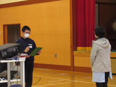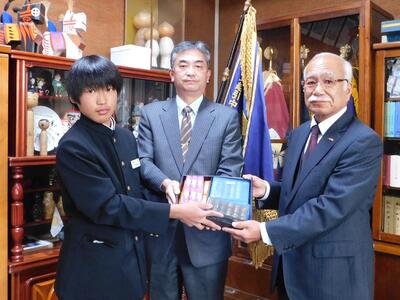 JRC委員長のA.Tさんが、生徒の皆さんや教職員から集めた募金35,713円を田村市社会福祉協議会会長の助川俊光様へ「地域のために使ってください。」と、手渡しました。