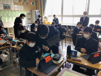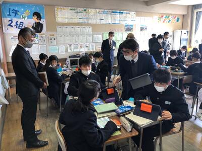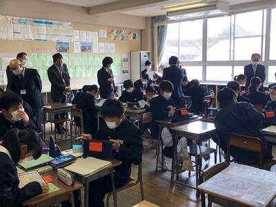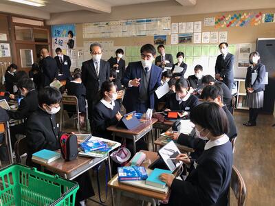 校長から来校された皆様に、本校の学校経営、SSR(スペシャルサポートルーム)運営、中高交流教員実践等の説明をしたのち、SSRの視察、本校吉田寛教諭の1年2組英語の授業を参観していただきました。