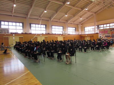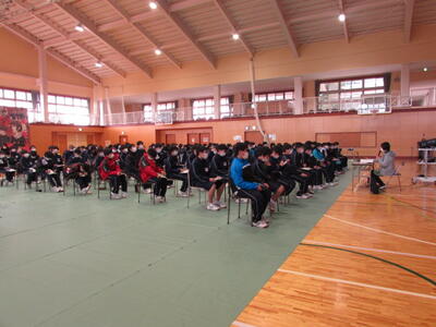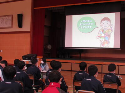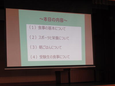 鈴木先生からは、「食事の基本について」、「スポーツと栄養について」、「朝ごはんについて」、「受験生の食事について」の4部構成でお話がありました。生徒は、バランスの取れた食事の重要性や、勉強や部活動で力が最大限に発揮できる栄養の取り方について理解を深めました。