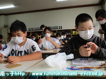 最後は、中学校の先生のご配慮で、記念になるもの「寄木でコース―ター」を作成!