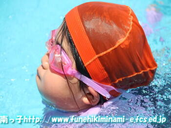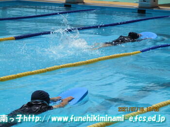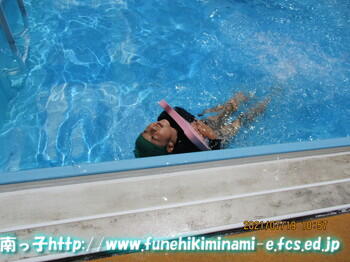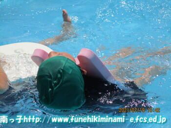 次はビート板でバック!頭ごちんとならないように気を付けて! 「あれ?ここどこ?壁は?」