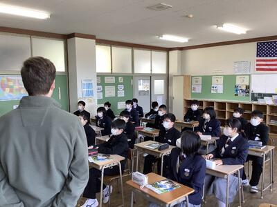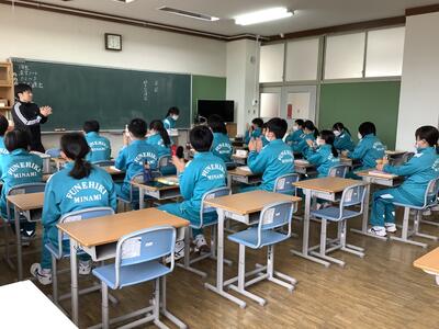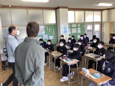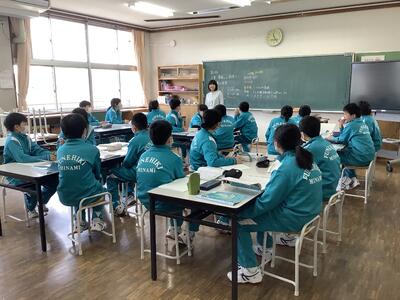 1校時目、1年生は英語の授業です。6年生のときから、英語の授業は中学校で行っていましたが、中学校では「書く活動」が、ぐんと増えます。準備するノートの注意点や、授業の進め方について確認をしました。