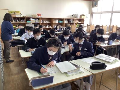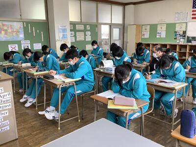 2年生は、英語の授業。これからの課題は「書く力」をつけること。英語をたくさん書いて練習して、正しく書く力を高めていってほしいです。