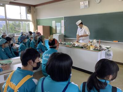 郡山市で日本料理店を営む加藤さんを講師にお招きし、2年生が調理実習を行いました。加藤さんは、京都や東京の料亭で腕を磨き、包丁の技能で日本一の経験をされているのだそうです。