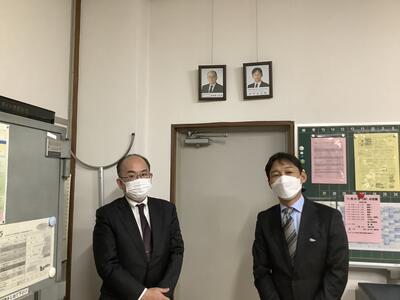 20日(月)、吉田前PTA会長様、高田前校長先生に来校いただき、校長室にて掲額式を行いました。