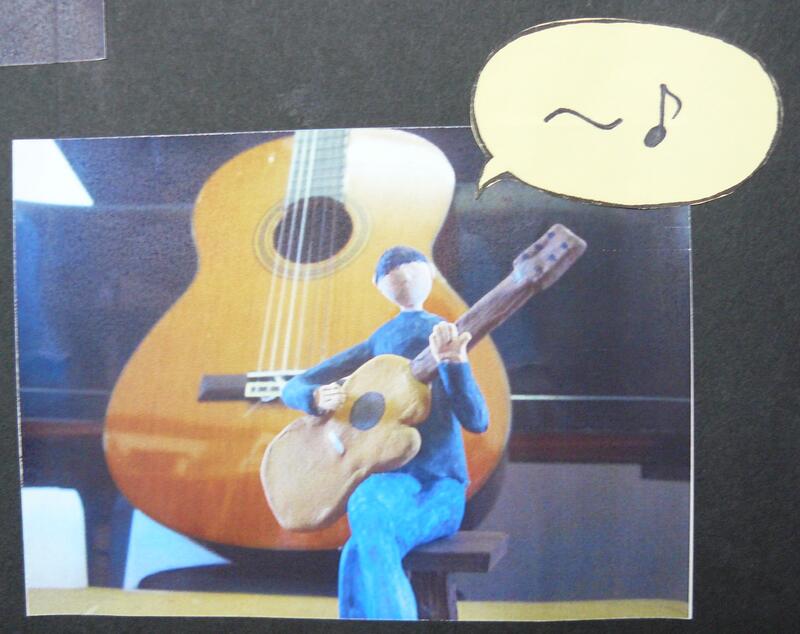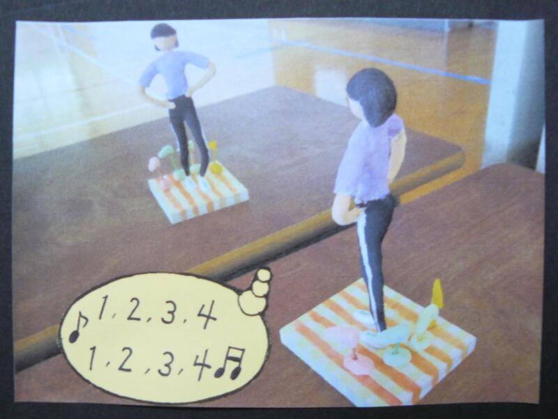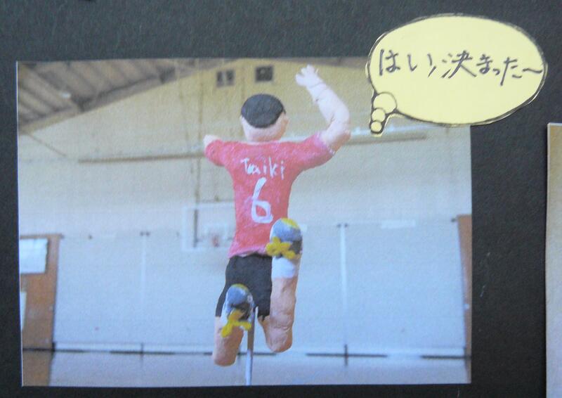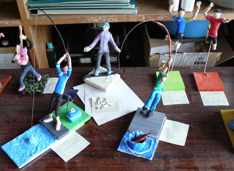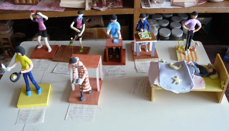2年生の美術作品で、紙粘土で人形を作成し、着色して仕上げてあります。美術室で見るとこのような感じですが…