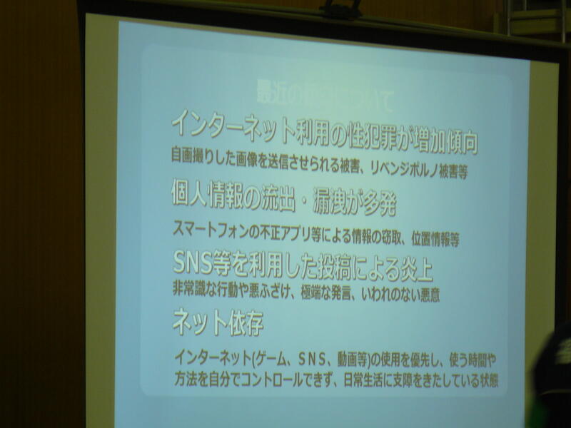 講師は、田村警察署の主任少年警察補導員の鬼頭美鈴さんです。4月の避難訓練時の際にも講話でお世話になっています。生徒がネットの被害に遭わないように、また、知らないがために自分が加害者とならないように、たくさんの実例を挙げながらお話していただきました。