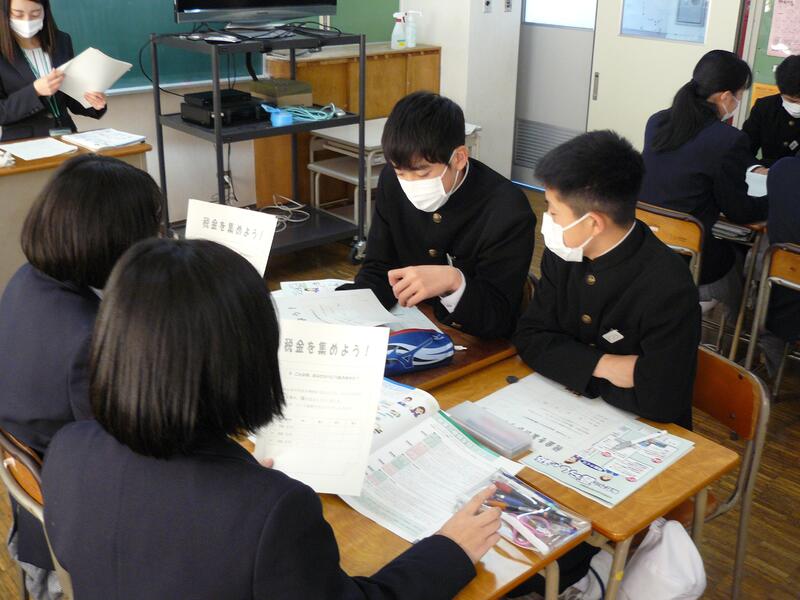 最初は、税は少ない方がよい、なくてもよいという意見を持つ生徒もいましたが、ビデオで税が果たしている様々な役割を知ったり、公正公平に集めるにはどのように考えればよいかグループで意見交換をしたりして、税に対する考えを深めました。税は国会で決められ、近い将来投票で国会議員を決める自分達にも関わることなんだという大事なメッセージをいただきました。橋本様、ありがとうございました。