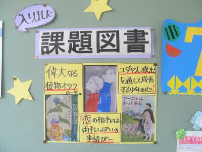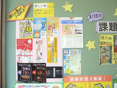 新しい本が110冊も図書館に入ったことや、読書感想文の課題図書について図書館支援員さんがカラーで紹介しています。思わず読みたくなってしまいますね。