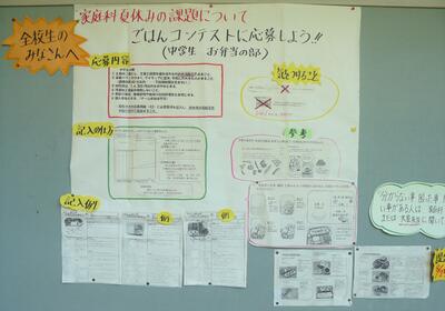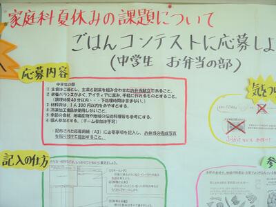 家庭科の夏休み課題になっているご飯コンテストについて詳しく書かれています。先日はマイ弁当の日もありましたね。自分であれこれ工夫しながら料理することはとっても楽しいです。ぜひこのコンテストでもアイデア一杯のおいしい料理を作成して欲しいと思います。