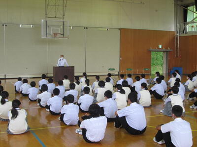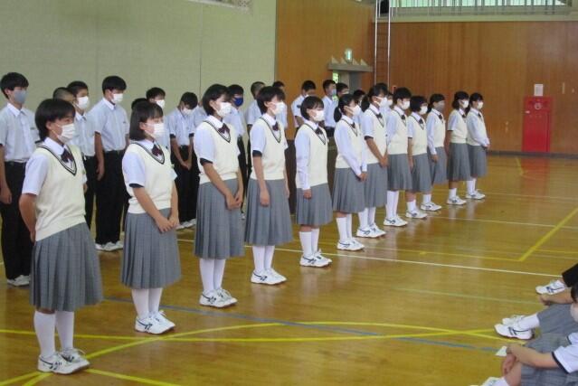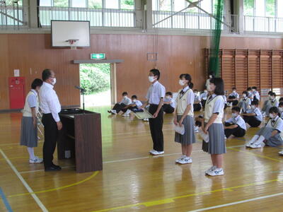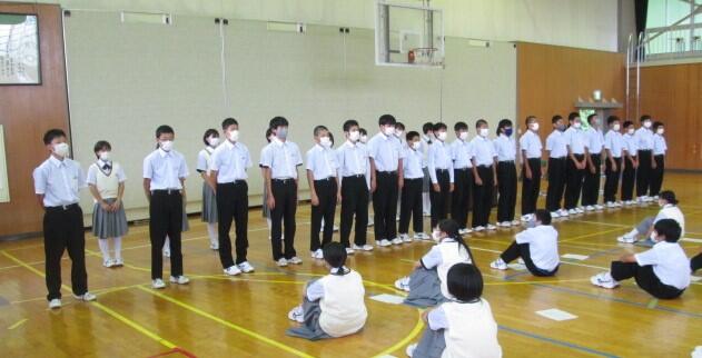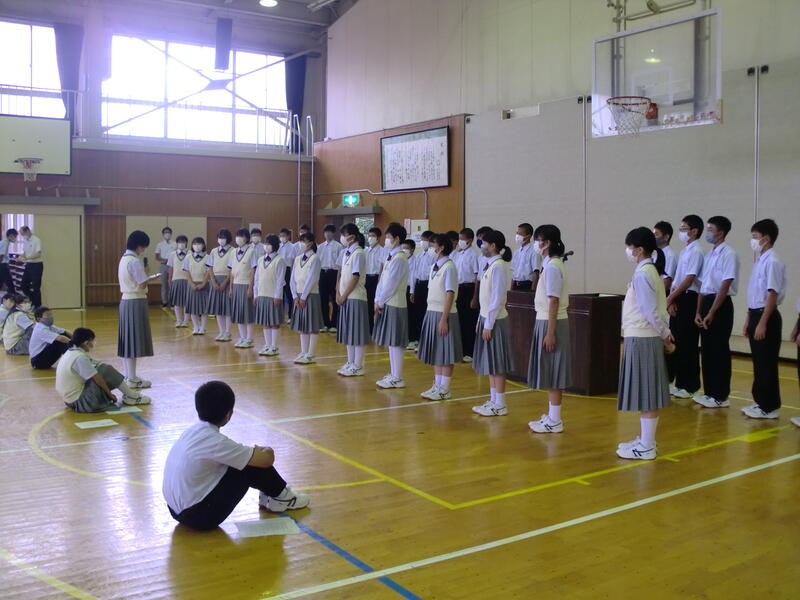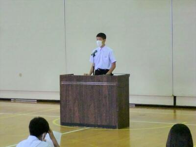 校長からは、無事夏休みが過ごせたことや、夏休み中に勉強や部活動などの諸活動を頑張って、成長している生徒が多いことを話しました。また、全国で爆発的に広がっている新型コロナウイルスの感染防止のために一層の注意が必要なこと、風邪症状等具合が悪いときには遠慮せず休養をとることなどを話しました。