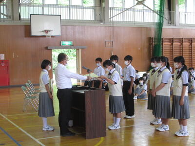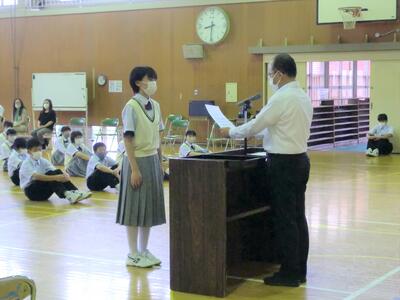 集会でははじめに夏休み中に行われた田村地区中学校音楽祭の表彰を行いました。