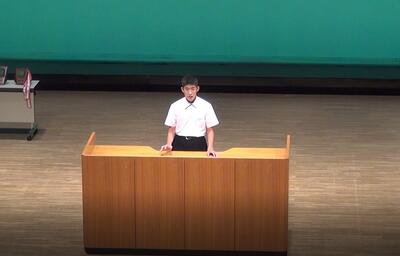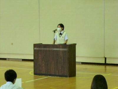 今日の全校集会では、表彰の後に校長の話、そして、各学年代表生徒による前期前半の反省と夏休みの抱負の発表がありました。