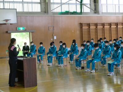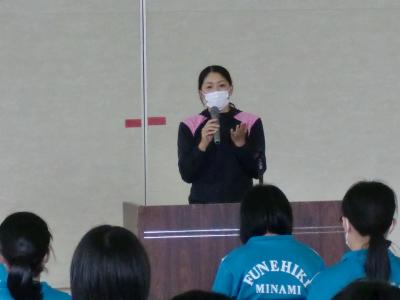 コロナ感染予防対策として、体育館で一人一人の間隔を広く取り常時換気をしたうえ、短い時間の講演となりましたが、千葉さんからは「夢を実現するために」をテーマに、「継続は力なり」、「夢をあきらめない」という言葉をいただきました。また、自分の夢を紙に書き常に意識すること、自分を褒めて自信を持つことの大切さを教えていただきました。