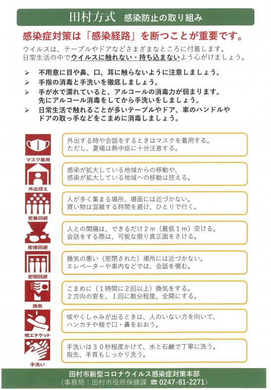 なお、チラシにあるとおり、感染症対策は「感染経路」を断つことが重要です。普段からウイルスに触れない・持ち込まないように注意し、発熱や体のだるさなどの症状がある場合は、通学を控えるようにし、事前に学校へご相談ください。よろしくお願いいたします。