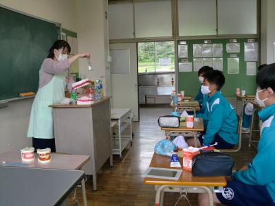 講義では、歯周病やその原因、健康な歯肉と歯肉炎との違いを聴き、実際に自分の口の中を鏡で観察してみました。普段よ~く見ることもなかった生徒もいて、驚いていたようです。