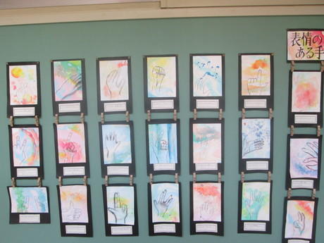 1階美術室前廊下の掲示板には、「表情のある手」の作品が、掲示されています。