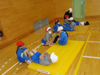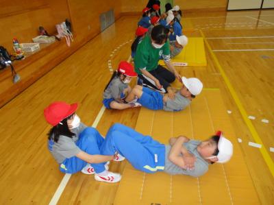 1・2年生の体育で、新体力テストの項目の「上体起こし」の練習をしました。腹筋に力を入れて、30秒間体を起こします。1年生は初めてでしたが、みんな一生懸命がんばっていました。