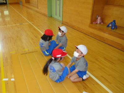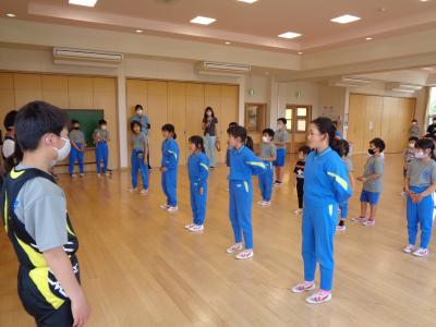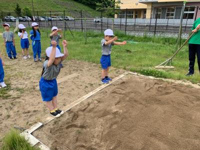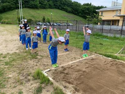 新体力テストの項目「立ち幅跳び」の練習をしました。準備運動後の補助運動で「カンガルージャンプ」をしているので、コツをうまくつかめている子が多かったです。何度か練習すると、どんどん上達することができました。