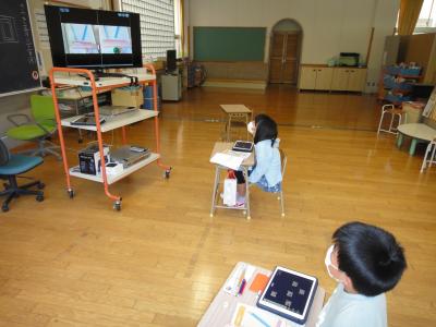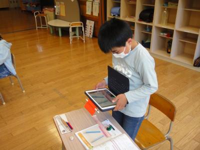 2年生の算数で「長さをはかってあらわそう」の学習をしています。教科書に描かれている鉛筆をどのように測ったのかを説明するために、タブレットを使って写真を撮り、テレビに映して友達のやり方と比べてみました。