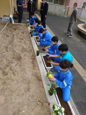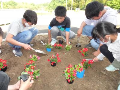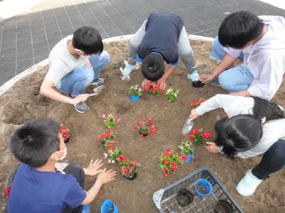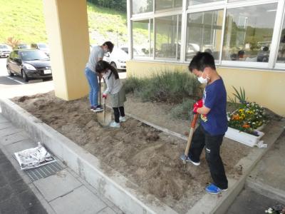 人権の花をたくさんいただいたので、委員会活動の時間に、体育環境委員会のみんなが学校の花壇を掘り起こし、肥料を入れ耕した後、花の苗を植えてくれました。