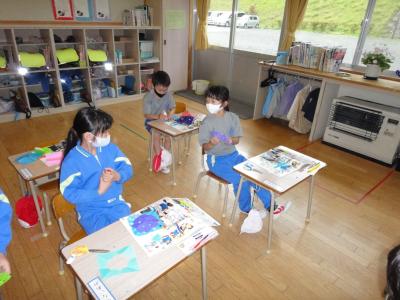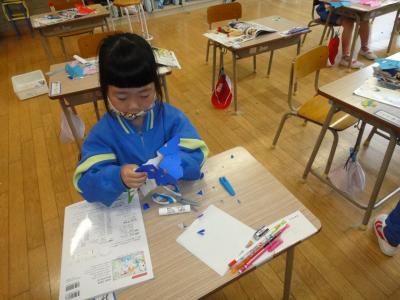 1年生の図工で、教室が楽しい感じになる飾り作りをしました。みんなはさみを上手に使ったり形を工夫させたりして、きれいな飾りをどんどん作りました。
