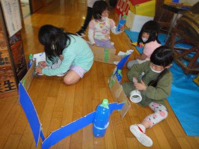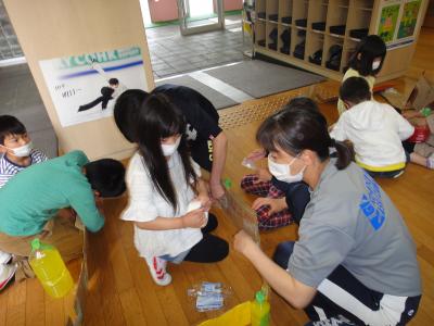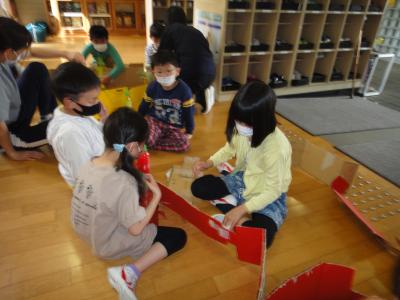 1・2年生が運動会で使う道具の1・2年生みんなで完成させました。段ボールを染めるところから作りはじめ、次に段ボールをつなげて、最後に「おもり」になる色水を入れたペットボトルを貼り付けて、遂に完成です!みんなで丁寧に作りました!