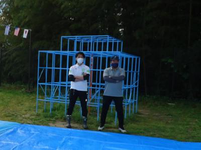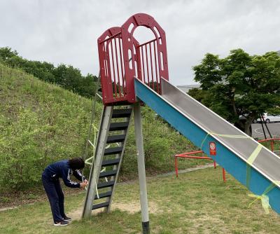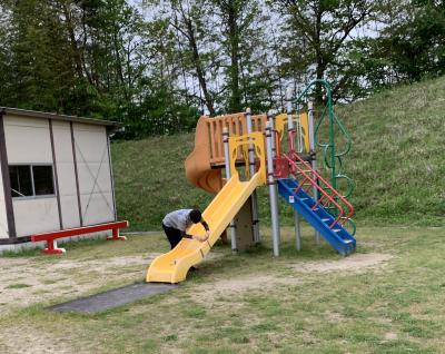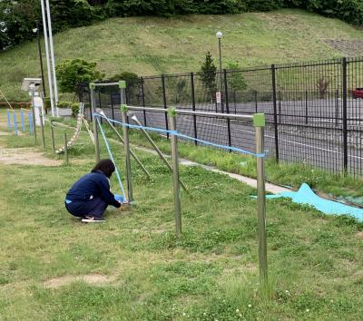 明日の天気が良くないようなので、1日前倒しで教職員が遊具を固定しました。運動会本番が安全にできるように職員も願っております。