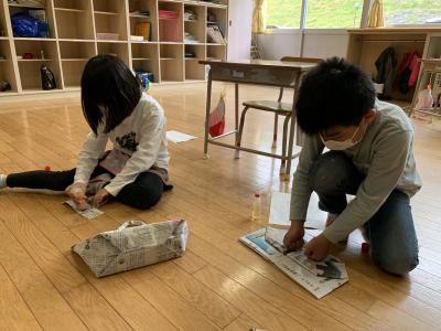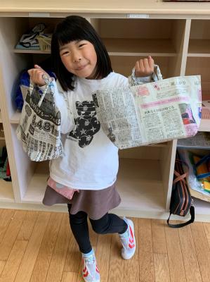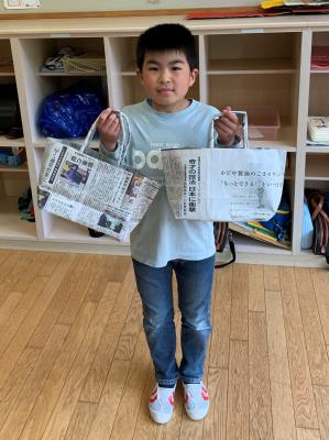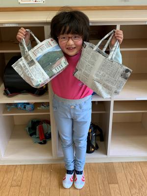 2年生の図画工作科の「新聞紙であそぼう」で、エコバッグを作りました。最初は「これがどうなるのかな?」と言いながら取っ手の部分から作りはじめ、折ったり切ったりを進めていくと…「あれ?できた!」「模様描いてもいいですか?」と大喜び。おうちへのお土産にもなりましたね!
