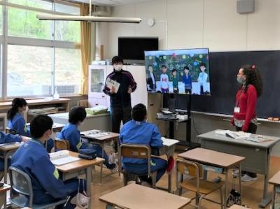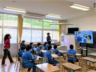 今日はヒラリー先生の来校日。外国語は単式で行います(5年生は髙島先生による国語です)。6年生の外国語は、自分の得意なものを紹介するという活動をしました。
