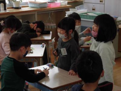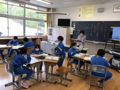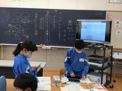 「きいて、きいて、きいてみよう」インタビューの準備の時間でした。友達に聞いてみたい話題をノートにまとめ、それを写真に撮りモニターに写し、みんなで見ながら話し合う授業です。タブレットの使い方も慣れたものです。今回は大型モニターは6年生に譲ってしまったので小さくて少しみずらかったようです。