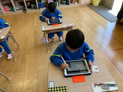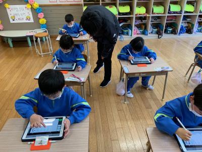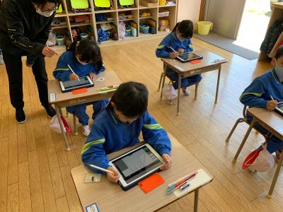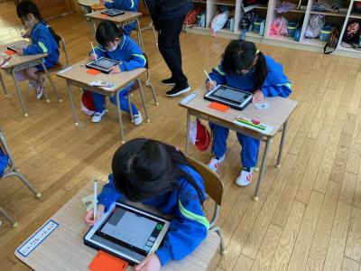 今日は1・2年生がタブレットドリル学習をしました。1年生は初めてタブレットにひらがなを書きました。1文字書いて画面をタッチして、また次の文字を書く…というやり方をあっという間に覚えて、楽しそうに進めていました。