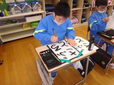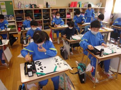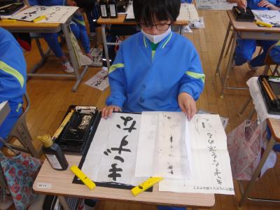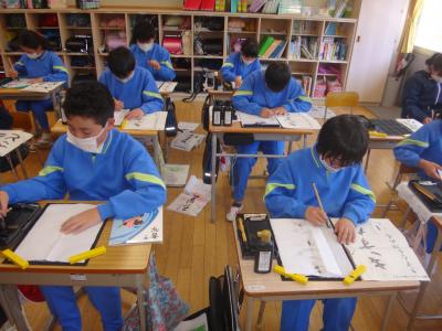 今日の5・6年生の6時間目は書写の時間でした。5年生は「ふるさと」、6年生は「きずな」を毛筆で書きました。5・6年生のクラスは全部で16人で、一番多い人数の学級ですが、さすがは高学年です。集中して静かに取り組んでいました。