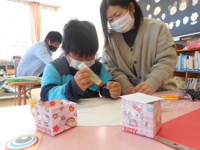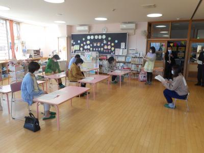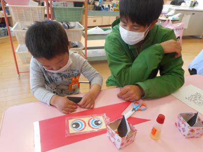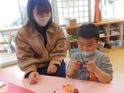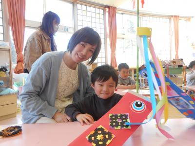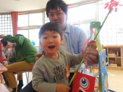 入園式から2週間が経ちました。今日は保育参観、幼稚園での様子を見ていただきました。親子でこいのぼりを作る作業では、手伝ってもらいながらも集中して取り組むことができました。かわいいこいのぼりができました。