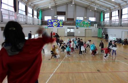 2015年2月4日 07時15分 「豆まき集会」 各学年の発表後は、5年生による豆まきです。1回目は、1~3年生。2回目は4~6年生です。殻付き落花生には、色が塗られたものがあり、その落花生を拾うといいことがあるのだそうです。何個拾うことができたでしょうか。ステージやギャラリーから豆が投げられました。