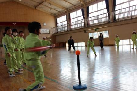 ティーボールは、野球によく似たゲームです。 野球と違うところは、ティーボールには投手がいないのです。 投手が投げたボールを打つのではなく、バッティングティーと呼ばれる細長い台の上に置いたボールを打ちます。 あとはほとんど野球といっしょなので、野球やソフトボールの入門者にうってつけのスポーツです。止まっているボールを打つので、スポーツが苦手な人でもちゃんとバットに当たります。 バットにボールが当たるので、チーム全員が協力しあって楽しむことができるのです。また、ティーボールの球はやわらかい球なので、室内でもプレイできます。 ティーボールは運動の苦手な子も楽しめるスポーツなので、 これをきっかけに体を動かす楽しさを知ってもらうことが目的のスポーツと言えるでしょう。4校時、体育の授業の様子です。