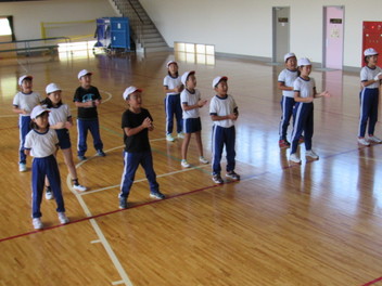 本日の昼休みは、陸上競技大会に参加する高学年のために、1年生から4年生までのが応援の練習を行いました。とても元気よくできました。