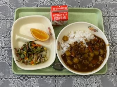 今日から給食がスタートしました。今日のメニューは、ポークカレーとりっちゃんサラダ、オレンジです。今まで、お弁当の準備ありがとうございました。