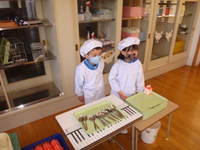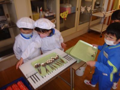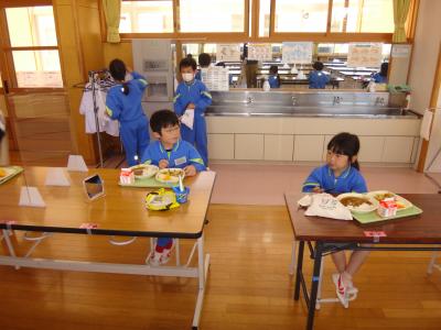 今日は今年度初の給食です。ということで、1年生が初めて給食当番をしました。スプーンを配ったり牛乳をお盆の上に乗せたり配膳をしたりと、みんな協力して上手に出来ました。その後の給食は、とってもおいしくいただきました。ごちそうさまでした!