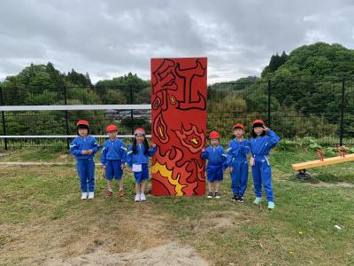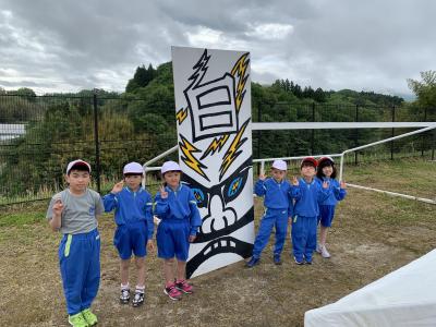 運動会の入場門が校庭に準備されました。大きな入場門の前で、1・2年生が紅組、白組に分かれて記念撮影をしました!