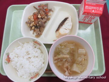 今日の給食は、ごはん、鯛の塩焼き、秋の五目豆、キャベツのみそ汁、牛乳です。