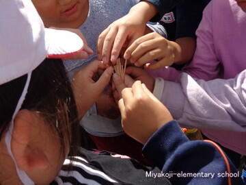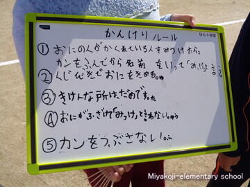 最初は「かんけり」をやりました。くじも手作りです。楊枝の先を赤く染め、赤い楊枝を引いた人が鬼です。