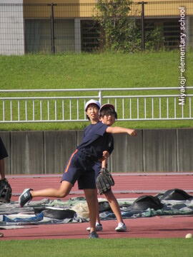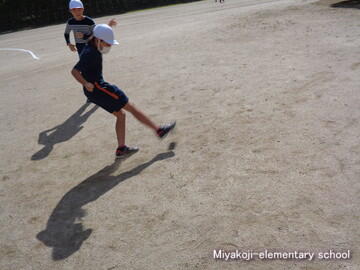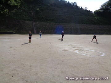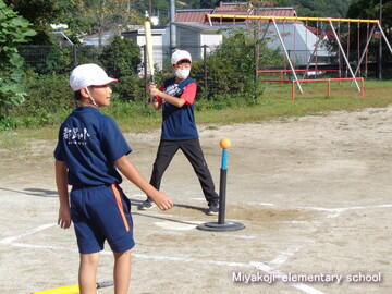 次は、ティーボールです。ラインも休み時間のうちに自分たちで引きました。苦手な友だちには、バットの持ち方や打ち方のフォーム、ボールを打つ方向をアドバイスしていました。